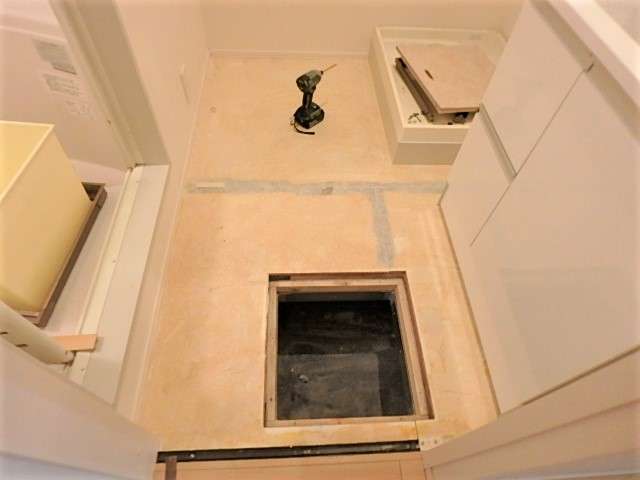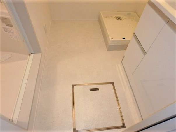こちらの洗面所は洗濯機の防水パンと洗面台が設置されており単純な四角形ではありませんので、